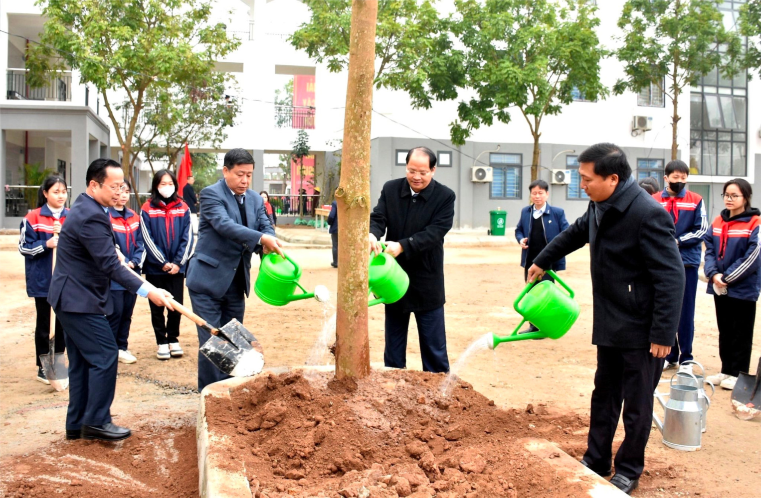 Đại diện lãnh đạo Bộ GD&ĐT, Sở GD&ĐT, UBND huyện Mê Linh trồng cây xanh tại Trường THCS Trưng Vương, huyện Mê Linh