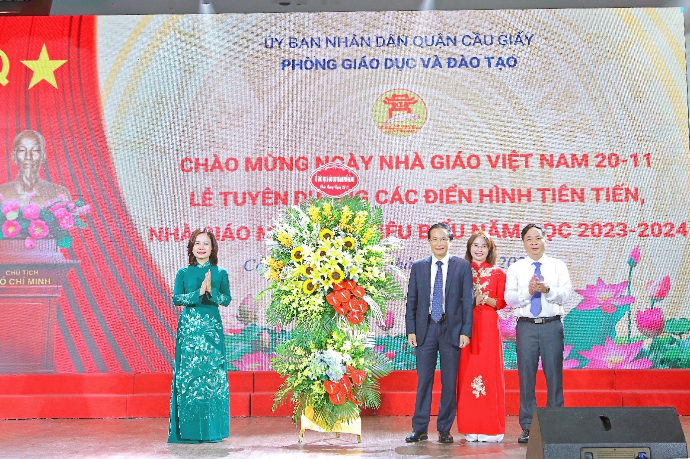 Lãnh đạo quận Cầu Giấy tặng hoa chúc mừng ngành giáo dục quận.Cùng với đó, quận luôn quan tâm dành mọi nguồn lực cho ngành giáo dục Quận, điển hình là công tác đầu tư xây dựng cơ sở vật chất đáp ứng nhu cầu dạy và học trong điều kiện trường học khang trang hiện đại…
