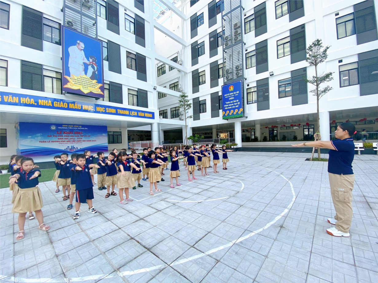 Cô trò Trường Tiểu học Đống Đa (quận Đống Đa) trong một giờ Giáo dục thể chất tại trường.