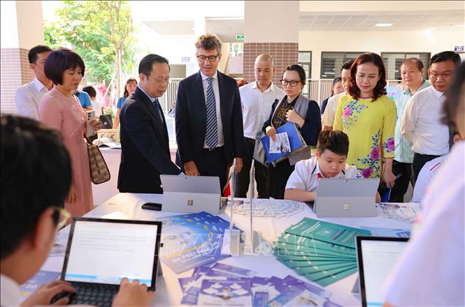 Các em học sinh đọc sách điện tử trong lễ phát động.