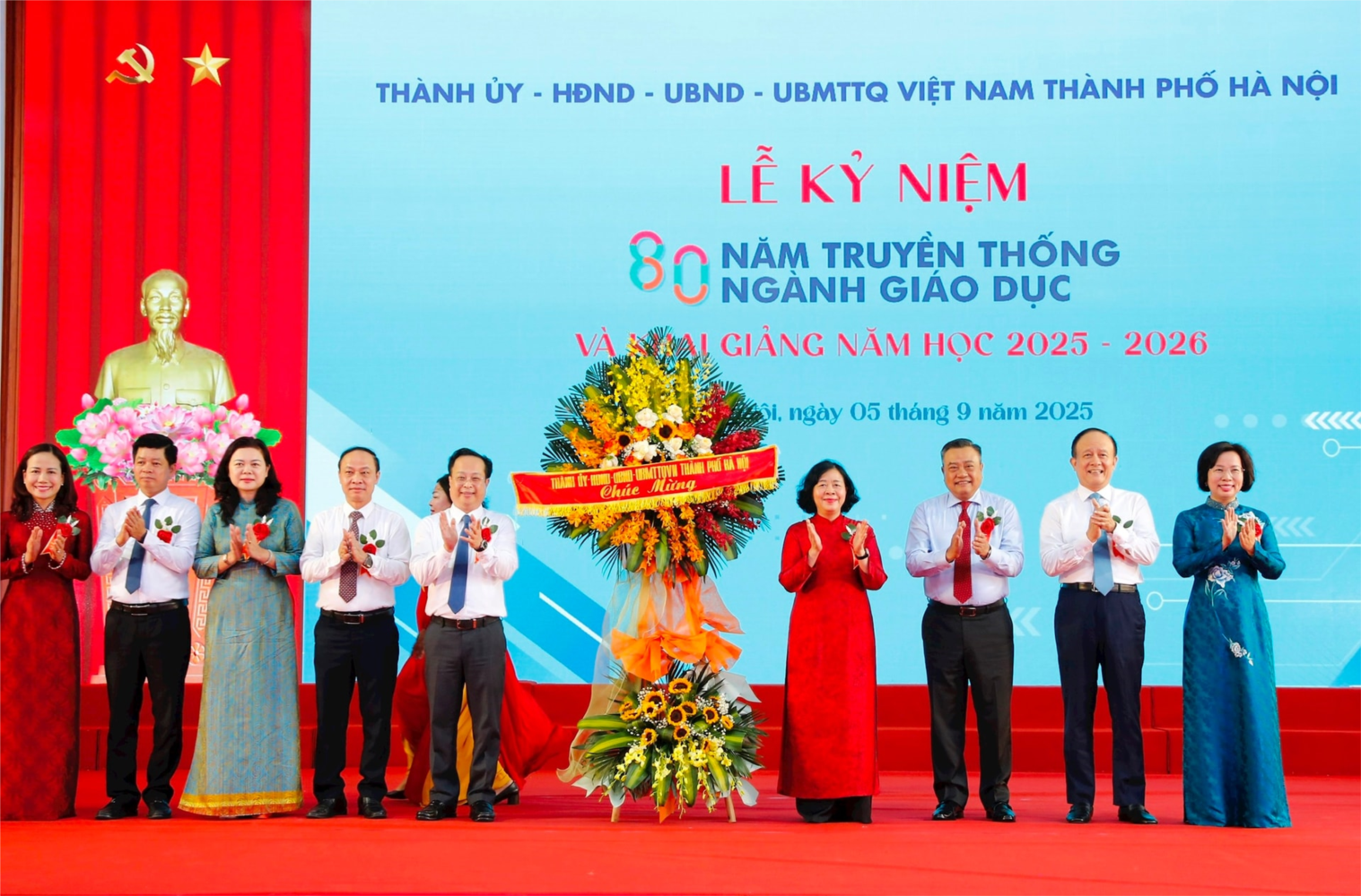 Bí thư Thành ủy Bùi Thị Minh Hoài cùng các đồng chí lãnh đạo TP Hà Nội tặng hoa chúc mừng cán bộ, giáo viên, nhân viên Ngành Giáo dục Thủ đô và Trường THPT Phan Huy Chú bước vào năm học mới