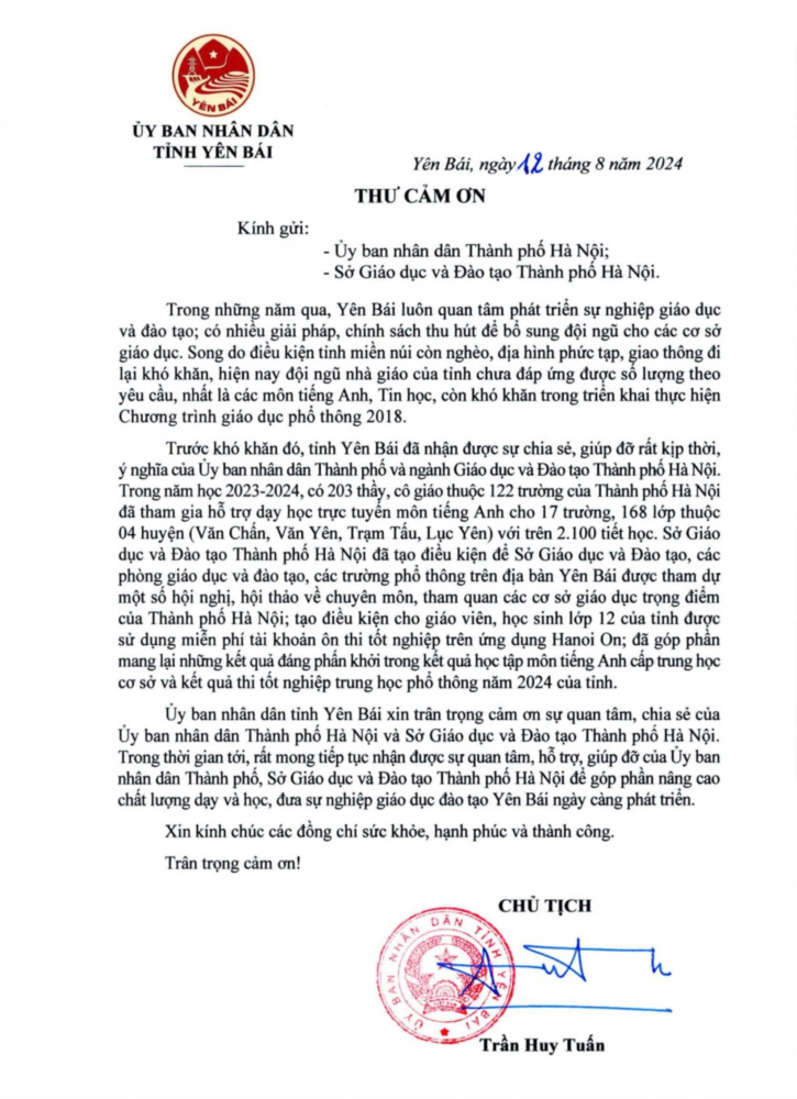 Ngày 12/8, Ủy ban nhân dân tỉnh Yên Bái gửi Thư cảm ơn tới Ủy ban nhân dân thành phố Hà Nội và Sở Giáo dục và Đào tạo thành phố Hà Nội.