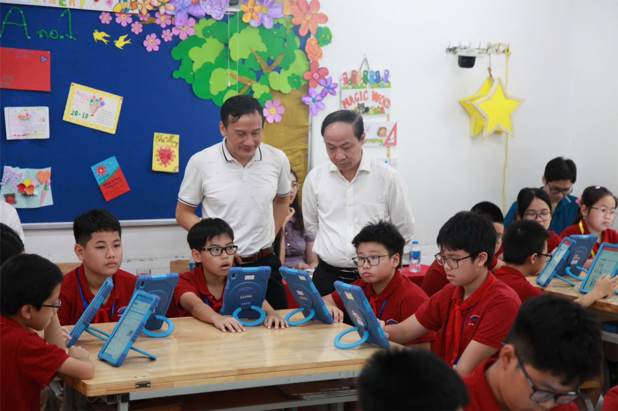 Phó Giám đốc Sở GD&ĐT Hà Nội Nguyễn Quang Tuấn cùng nhóm chuyên gia tham quan lớp học thông minh tại Trường PTCS Nguyễn Đình Chiểu.