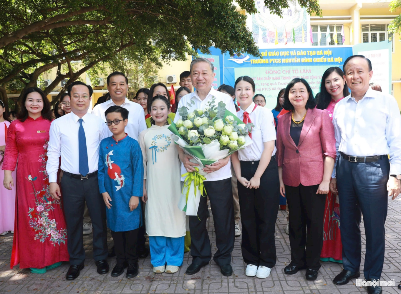 Tổng Bí thư Tô Lâm và các đồng chí đoàn công tác cùng các thầy, cô giáo và học sinh hai trường. Ảnh: Viết ThànhĐồng chí Tô Lâm cũng đề nghị các nhà trường cần chủ động kết nối với bệnh viện, các tổ chức y tế, các cơ sở giáo dục nghệ thuật - thể thao - nghề nghiệp để xây dựng môi trường học tập đa chiều, giúp các cháu không chỉ học chữ mà còn học nghề, học làm người, học sống hạnh phúc.