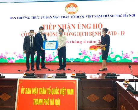 Đại diện Ban Giám hiệu trường THPT Nguyễn Gia Thiều trao ủng hộ công tác phòng chống dịch tại UBMT TQ Thành phố