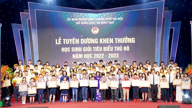 Các em học sinh giỏi tiêu biểu Thủ đô được lãnh đạo Bộ GDĐT, lãnh đạo Thành ủy, lãnh đạo UBND Thành phố và lãnh đạo Sở GDĐT tuyên dương khen thưởng năm học 2022-2023.