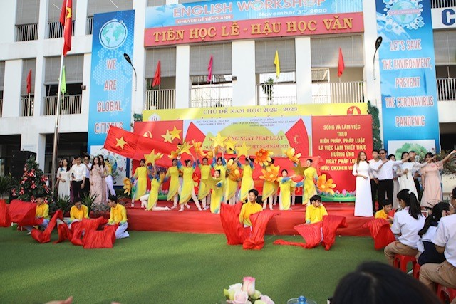 Trong buổi tuyên truyền, cô giáo Lê Minh Nguyệt, Bí thư Chi bộ, Hiệu trưởng nhà trường và em đại diện học sinh toàn trường đã lên phát biểu hưởng ứng Ngày Pháp luật Việt Nam năm 2022.