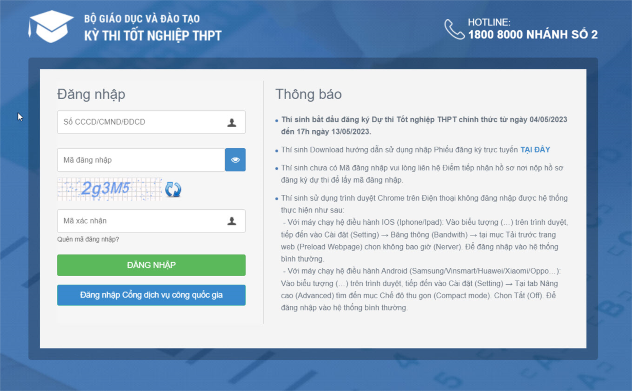 - Từ ngày 04/5/2023 đến 17h ngày 13/5/2023: thí sinh đang học lớp 12 năm học 2022-2023 chính thức đăng ký dự thi tốt nghiệp THPT trực tuyến năm 2023 trên hệ thống. (Thông tin đăng ký của thí sinh chỉ được công nhận trong thời gian đăng ký chính thức từ ngày 04/5/2023 đến 17h ngày 13/5/2023).
