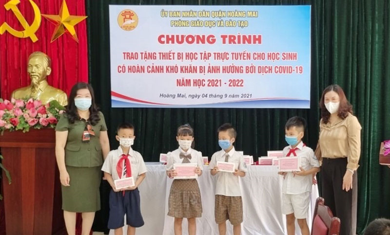 Phòng Giáo dục và Đào tạo quận Hoàng Mai tặng thiết bị học trực tuyến cho học sinh.