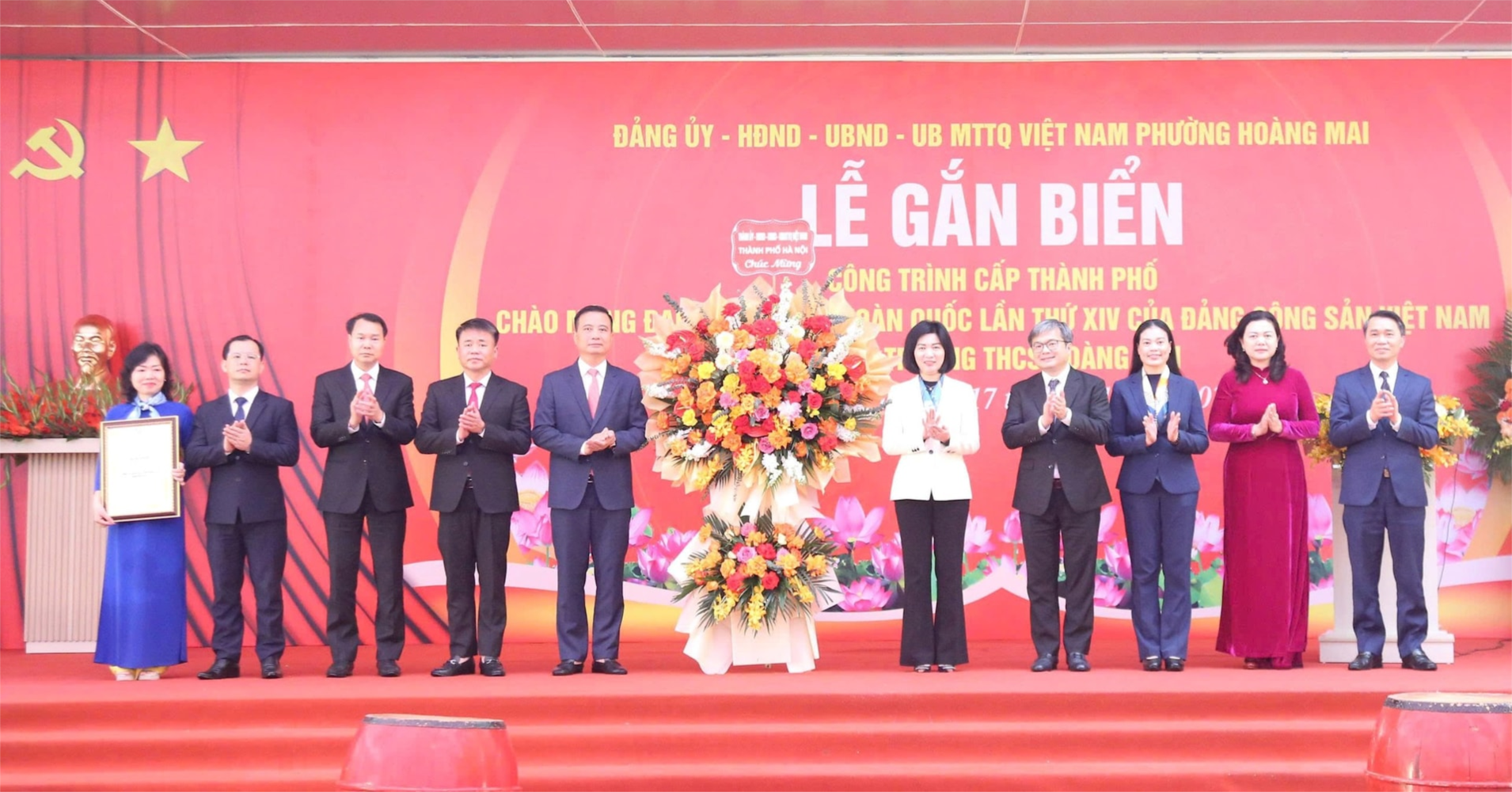 Tại lễ gắn biển, Chủ tịch HĐND thành phố Phùng Thị Hồng Hà và Phó Chủ tịch UBND thành phố Trương Việt Dũng trao Bằng công nhận công trình xây dựng Trường THCS Hoàng Mai là công trình chào mừng Đại hội đại biểu toàn quốc lần thứ XIV của Đảng và tặng hoa chúc mừng phường, Ban Giám hiệu nhà trường. Phó Chủ tịch UBND thành phố Trương Việt Dũng trao Bằng khen của Chủ tịch UBND thành phố tặng 1 tập thể, 2 cá nhân có thành tích trong tham gia thực hiện công trình.