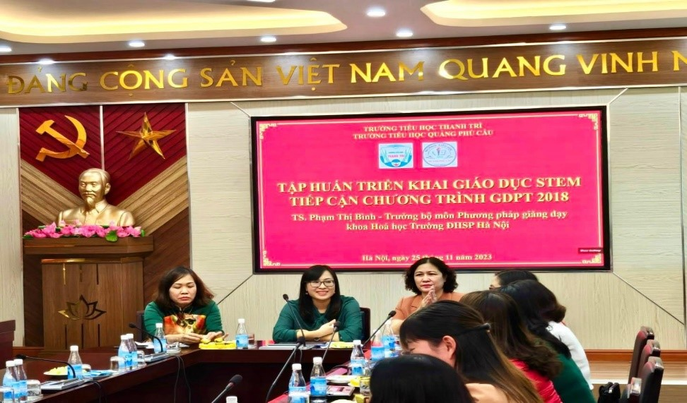 Với mục tiêu nâng cao chất lượng sinh hoạt tổ chuyên môn tại nhà trường, tạo điều kiện để giáo viên giao lưu, trao đổi, học tập kinh nghiệm dạy học theo chương trình giáo dục phổ thông 2018, sáng ngày 25/11/2023, trường Tiểu học Thanh Trì và trường Tiểu học Quảng Phú Cầu đã tập huấn triển khai giáo dục STEM tiếp cận Chương trình GDPT 2018 do TS Phạm Thị Bình - Trưởng bộ môn Phương pháp dạy học khoa Hóa học trường ĐHSP Hà Nội hướng dẫn, trao đổi.