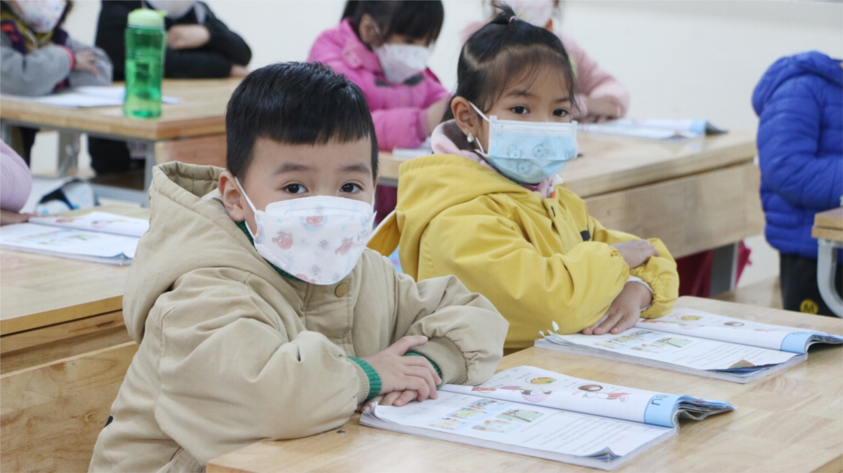 Khi học, các em sẽ đeo khẩu trang và không giao tiếp với học sinh lớp khác.