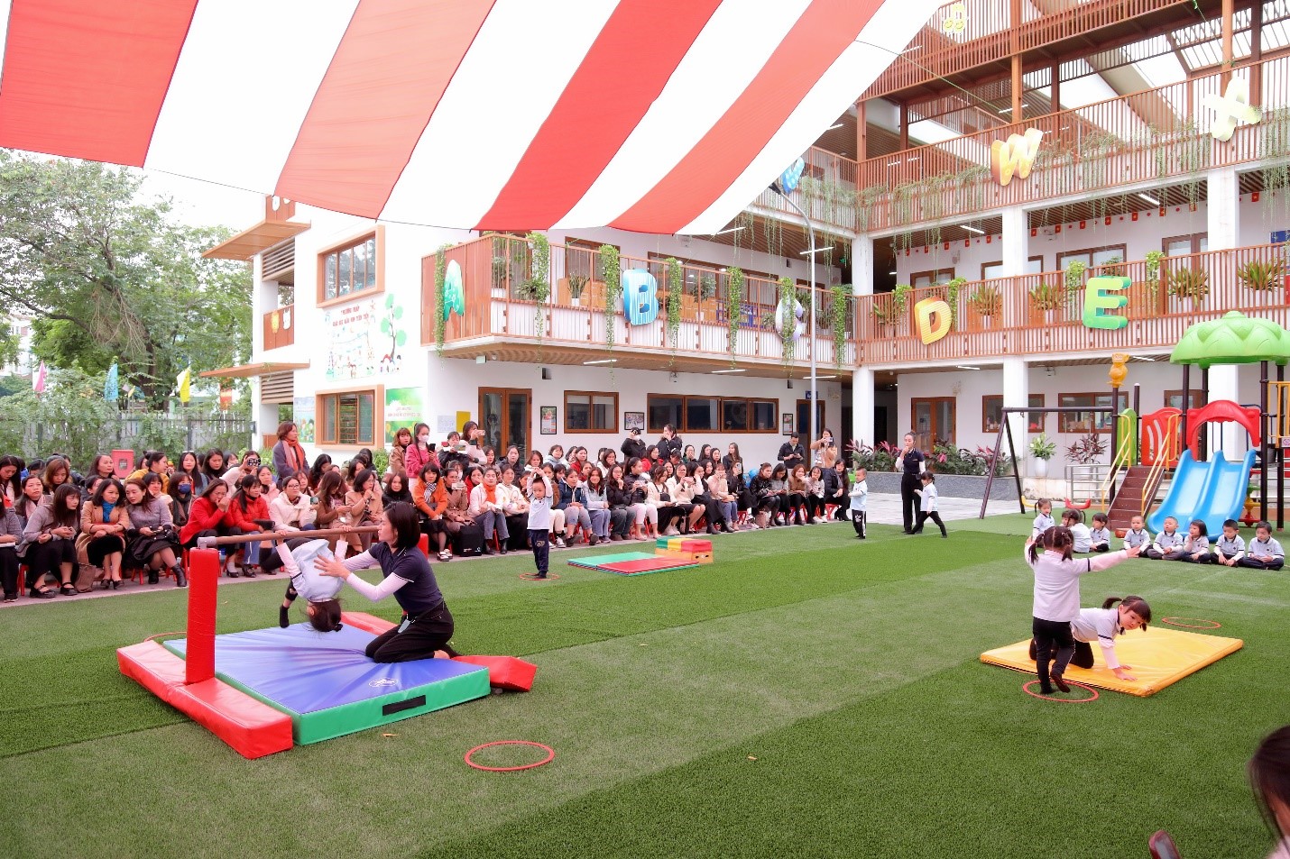 Với khối mẫu giáo nhỡ, các bé được tham gia hoạt động tập vận động nhẩy bục - đu xà - lăn thảm. Điểm mới của hoạt động đó là chủ yếu sử dụng hiệu lệnh và vận động mẫu, tăng cường số lần vận động để trẻ liên tục được thực hiện, giảm tải tối đa việc hướng dẫn bằng lời; khai thác tối đa đồ dùng, phương tiện đã chuẩn bị.