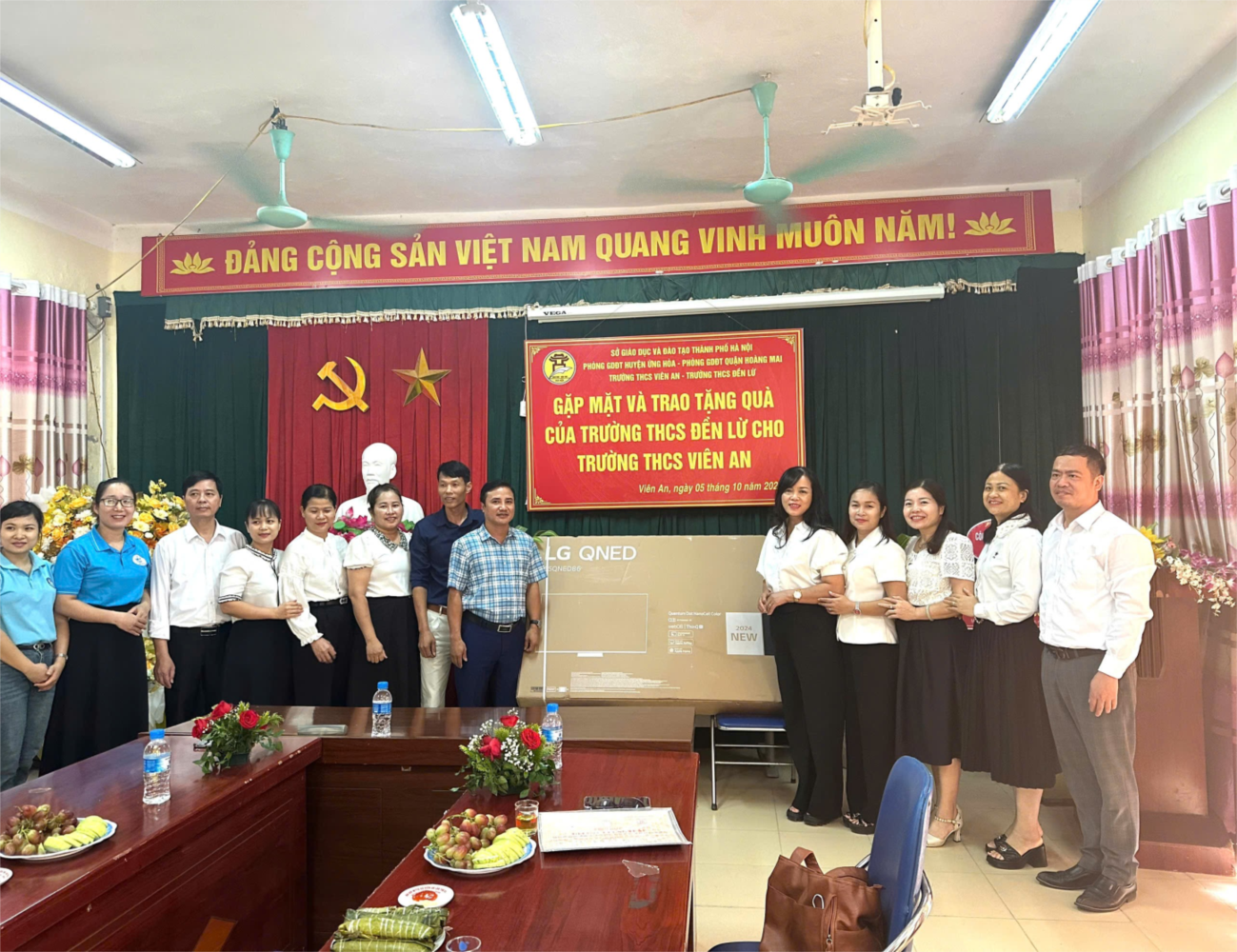 Mặc dù cũng chịu ảnh hưởng bởi cơn bão số 3, nhưng khi nắm bắt tình hình Trường THCS Viên An - đơn vị trường kết nghĩa bị thiệt hại, Ban giám hiệu trường THCS Đền Lừ đã cùng Công đoàn nhà trường và đại diện các tổ chuyên môn tới trường THCS Viên An chia sẻ, gửi tặng nhà trường chiếc Tivi 65 inch – món quà ý nghĩa từ nguồn ủng hộ đồng bào khắc phục bão lũ của giáo viên, học sinh trường THCS Đền Lừ. Với 12 phòng học nhưng Trường THCS Viên An chỉ có 04 chiếc máy chiếu nên việc sử dụng còn nhiều hạn chế, chiếc tivi sẽ góp phần hỗ trợ tốt hơn cho hoạt động dạy học của trường THCS Viên An.