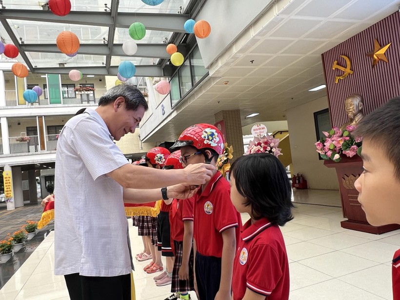 | Bí thư Quận uỷ Ba Đình, Hoàng Minh Dũng Tiến đội mũ bảo hiểm cho học sinh trường Tiểu học Kim Đồng. |