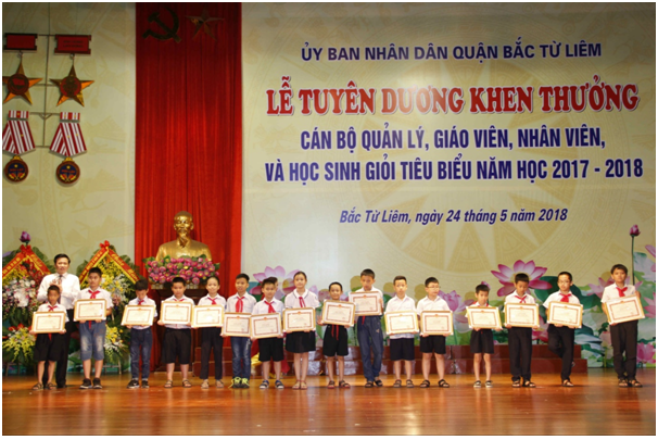 Nhằm khen thưởng và động viên kịp thời các tập thể, cá nhân đạt được thành tích xuất sắc trong năm học 2017-2018, tạo động lực thúc đẩy các phong trào thi đua các phong trào thi đua trong các cơ sở giáo dục, góp phần nâng cao chất lượng và hiệu quả giáo dục, sáng ngày 24/5, quận Bắc Từ Liêm long trọng tổ chức Lễ tuyên dương khen thưởng cho hơn 300 cán bộ quản lý, giáo viên, nhân viên, học sinh giỏi tiêu biểu năm học 2017-2018. Dự Lễ khen thưởng có các đồng chí: Trần Thị Thu Hà – Chủ tịch Công đoàn Sở Giáo dục & Đào tạo Hà Nội; Nguyễn Công Khanh – UVBTV, Phó Bí thư thường trực; Nguyễn Văn Việt – UVBTV, Phó Chủ tịch HĐND Quận; Nguyễn Xuân Ứng – UVBTV, Chủ nhiệm Ủy ban Kiểm tra; Nguyễn Thị Hương – Trưởng phòng Giáo dục & Đào tạo quận Nam Từ Liêm; Lê Thị Thu Hương – Trưởng phòng Giáo dục & Đào tạo quận; Chủ tịch 13 phường; các đồng chí hiệu trưởng các trường Mầm non, Tiểu học, THCS trên địa bàn Quận; các đồng chí cán bộ, giáo viên, nhân viên học sinh giỏi tiêu biểu trên địa bàn Quận.