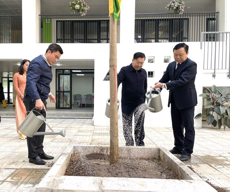 Lãnh đạo quận Đống Đa và phường Quang Trung trồng cây tại vườn hoa 1/6.