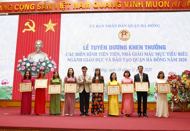 Chào mừng kỷ niệm Ngày Nhà giáo Việt Nam 20/11, sáng 18/11, Phòng Giáo dục và Đào tạo quận Hà Đông long trọng tổ chức Lễ tuyên dương khen thưởng các điển hình tiên tiến, nhà giáo mẫu mực tiêu biểu ngành Giáo dục và Đào tạo năm 2020. Đến dự có Tiến sỹ Trần Đình Châu, Phó trưởng Ban chỉ đạo đổi mới chương trình sách giáo khoa giáo dục phổ thông, Bộ GDĐT; Tiến sỹ Trần Thị Thu Hà- Chủ tịch công đoàn Giáo dục Thủ đô; ông Đàm Xuân Quang-Phó chánh văn phòng Sở GDĐT đại diện lãnh đạo Sở GD&ĐT. Về phía lãnh đạo quận có ông Nguyễn Văn Trường - Phó Bí thư Thường trực, Chủ tịch HĐND quận; bà Cấn Thị Việt Hà - Phó Bí thư Quận ủy, Chủ tịch UBND quận cùng đông đảo các thầy cô giáo là Bí thư chi bộ-Hiệu trưởng, phó hiệu trưởng, những điển hình tiên tiến của ngành GD&ĐT quận.