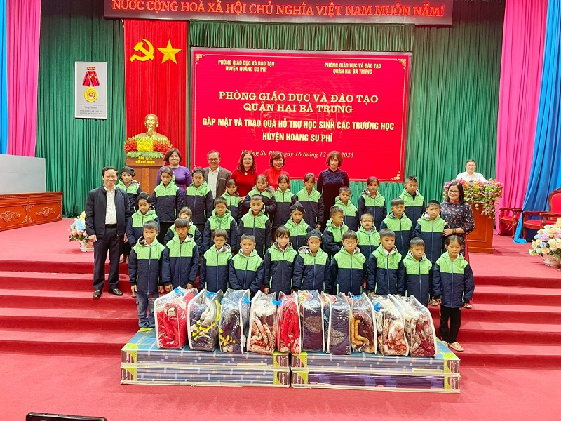 Ngày 16,17/12/2023 được sự đồng ý của Lãnh đạo quận Hai Bà Trưng đoàn công tác gồm 08 đồng chí, Trưởng đoàn là đồng chí Nguyễn Thị Thu Hiền, UVBTV Quận ủy, Phó Chủ tịch UBND Quận; Phó Trưởng đoàn là đồng chí Cấn Văn Đa, Trưởng phòng GD&ĐT Quận cùng các đồng chí lãnh đạo, chuyên viên phòng GD&ĐT Quận, các đồng chí Hiệu trưởng đại diện 03 cấp học trên địa bàn quận đã đến thăm và trao tặng quà cho cho học sinh và ký kết hỗ trợ dạy học online cho các em học sinh lớp 3, lớp 4 theo chương trình GDPT 2018 tại một số trường Tiểu học huyện Hoàng Su Phì, tỉnh Hà Giang.