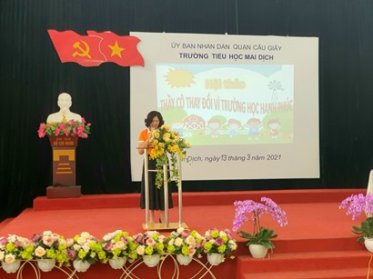 Đến dự buổi Hội thảo, nhà trường vui mừng chào đón sự có mặt của Tiến sĩ Nguyễn Ngọc Ân - Phó Chủ tịch Công đoàn Giáo dục Việt Nam - chuyên gia dự án “Trường học hạnh phúc” Bộ Giáo dục và Đào tạo, Tiến sĩ Trần Thị Thu Hà - Chủ tịch Công đoàn Giáo dục Thành phố Hà Nội và toàn thể CBGVNV nhà trường. Phát biểu khai mạc hội nghị, đồng chí Hiệu trưởng Nguyễn Thanh Tịnh đã nhấn mạnh vai trò, tầm quan trọng của việc xây dựng mô hình Trường học hạnh phúc đồng thời cũng bày tỏ mong muốn mỗi cá nhân trong nhà trường sẽ thay đổi để làm tốt hơn công việc của mình bằng cả trách nhiệm, tình yêu thương, sự thấu hiểu, cảm thông và chia sẻ.