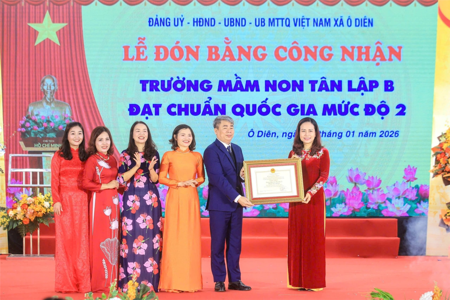 Lãnh đạo Sở Giáo dục và Đào tạo Hà Nội trao Bằng công nhận cho xã Ô Diên và nhà trường. Ảnh: Văn ThắngTrường Mầm non Tân Lập B, xã Ô Diên có khuôn viên rộng hơn 9.500m2, bình quân 15m2/trẻ với hệ thống 21 phòng học, 10 phòng chức năng, khu hiệu bộ, cùng sân chơi, cổng trường, tường rào được đầu tư đồng bộ, khang trang. Mỗi hạng mục đều được quy hoạch, bố trí khoa học, phù hợp với đặc điểm tâm sinh lý và từng độ tuổi của trẻ mầm non. Cùng với các phòng học tiêu chuẩn, nhà trường đầu tư các phòng chức năng như STEM, Montessori, tiếng Anh, Âm nhạc, nghệ thuật sáng tạo, giáo dục thể chất, tin học và thư viện, được bố trí khoa học, trang bị đồ dùng, học liệu phù hợp, tạo điều kiện để trẻ được trải nghiệm, khám phá, phát triển tư duy, ngôn ngữ, thể chất và thẩm mỹ một cách toàn diện.