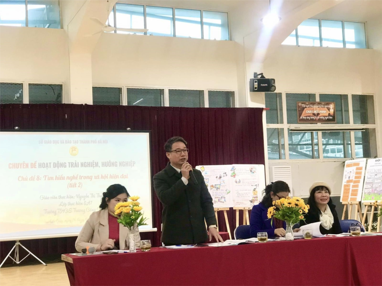 Dự tiết chuyên đề có đồng chí Trần Đăng Nghĩa – Phó Trưởng phòng Giáo dục Trung học, đồng chí Lương Thu Thuỷ - Chuyên viên Phòng Giáo dục Trung học, Sở GDĐT Hà Nội. Chuyên đề còn có sự tham dự, tư vấn và trao đổi của PGS.TS Đinh Thị Kim Thoa – Tổng Chủ biên chương trình, tác giả sách giáo khoa HĐTNHN Bộ Chân trời sáng tạo 1; lãnh đạo, chuyên viên Phòng GDĐT quận Cầu Giấy cùng các thầy cô giáo là cán bộ quản lí và giáo viên cốt cán HĐTNHN của 30 quận huyện trên địa bàn Thành phố Hà Nội.