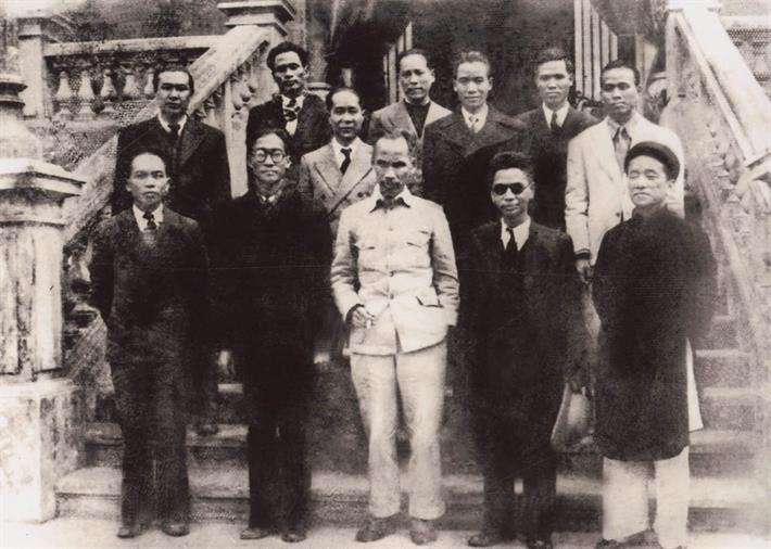 Chủ tịch Hồ Chí Minh và các thành viên Chính phủ lâm thời nước Việt Nam Dân chủ Cộng hoà. Bộ trưởng Bộ Quốc gia Giáo dục Vũ Đình Hoè đứng hàng đầu thứ 2 từ trái sang.