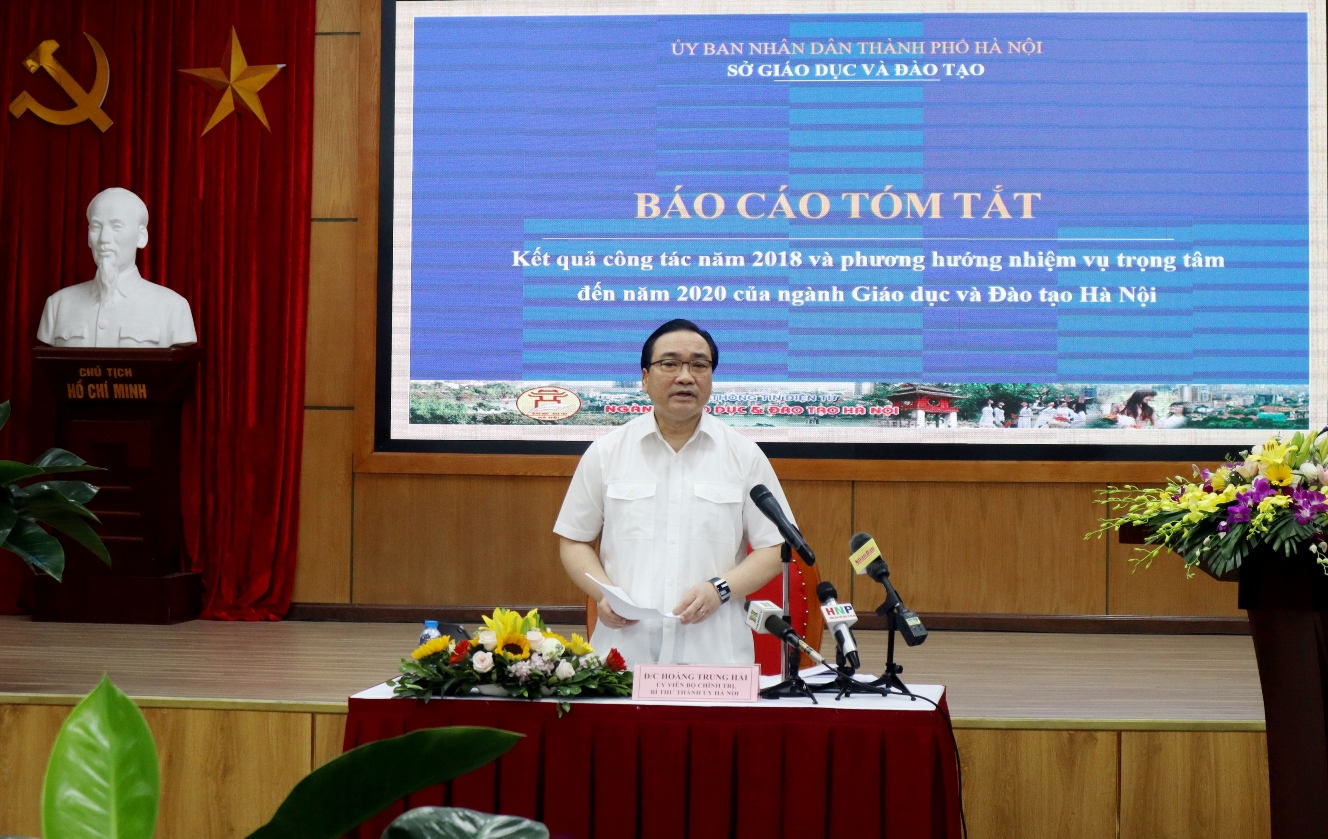Phát biểu tại buổi làm việc, đồng chí Hoàng Trung Hải - Ủy viên Bộ Chính trị, Bí thư Thành ủyđánh giá cao kết quả ngành GD&ĐT Hà Nội đạt được trong những năm qua. Cụ thể, ngành GD&ĐT Hà Nội đã làm tốt công tác giáo dục chính trị tư tưởng cho đội ngũ cán bộ quản lý, giáo viên, nhân viên. Sắp xếp bộ máy tinh gọn, hiệu lực, hiệu quả, đồng thời thường xuyên phát huy dân chủ, thực hiện tốt công tác kiểm tra, giám sát, các chỉ thị, nghị quyết của Trung ương và Thành phố. Về công tác chuyên môn, Hà Nội tiếp tục giữ vị trí dẫn đầu cả nước trong giáo dục đại trà cũng như các kết quả mũi nhọn thi HSG quốc gia, quốc tế. Ngành GD&ĐT Hà Nội cũng đã chủ động, tích cực trong công tác hội nhập quốc tế, mở ra các hình thức đào tạo theo hướng hội nhập.