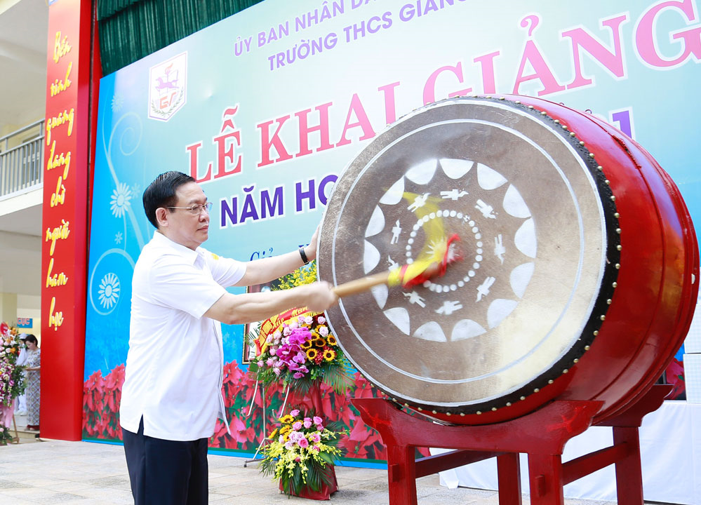 Trong không khí hân hoan chào mừng năm học mới, Giáo sư, Tiến sĩ, Nhà giáo ưu tú Vương Đình Huệ, Ủy viên Bộ Chính trị, Bí thư Thành ủy Hà Nội đã đánh trống khai giảng năm học 2020-2021.