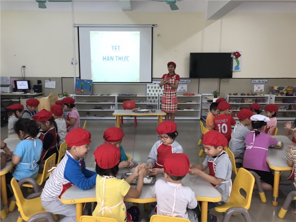 Trước khi bắt tay vào làm, các bạn nhỏ được nghe cô giáo kể về ý nghĩa của ngày Tết Hàn Thực, được nghe cô giáo giới thiệu rất kĩ về nguyên liệu, cách làm bánh trôi, bánh chay.
