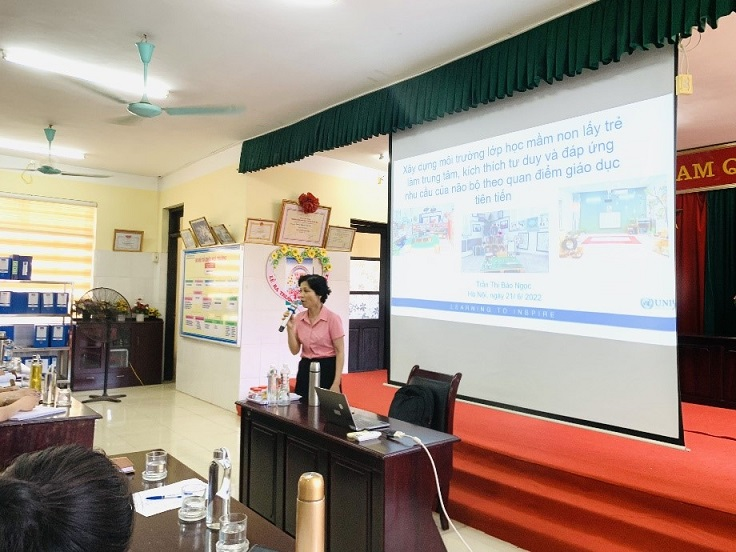 Tại buổi tập huấn, giảng viên đã chia sẻ những kiến thức vô cùng cần thiết, quan trọng về vai trò của môi trường đối với phát triển của não bộ trẻ mầm non; những nguyên tắc xây dựng môi trường kích thích tư duy và đáp ứng nhu cầu phát triển não bộ của trẻ. Thông qua buổi tập huấn giảng viên đã giúp các cán bộ quản lý hiểu được bản chất của việc sắp xếp, xây dựng môi trường, chủ động nhận ra điểm mạnh, điểm yếu và xác định giải pháp cho mỗi đơn vị nhà trường.