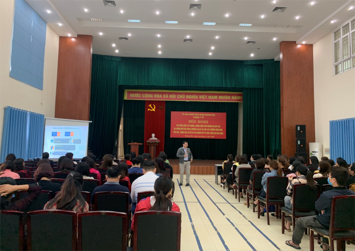 Để làm tốt công tác phòng chống dịch Covid-19 thì việc tập huấn cho cán bộ, giáo viên, nhân viên cấp học Mầm non hiểu đúng về dịch bệnh và biết cách xử lý các tình huống khi học sinh quay lại trường học sau thời gian tạm nghỉ là một trong những biện pháp vô cùng quan trọng. Phòng GDĐT đã phối hợp với Trung tâm Y tế Quận tổ chức 02 buổi tập huấn cho 49 nhân viên Y tế của các trường Mầm non trên địa bàn Quận tại Hội trường Trung tâm Y tế Quận vào ngày 31/1/2020 và ngày 26/2/2020. Ngày 27/2/2020, 49 trường Mầm non đã tổ chức tập huấn cho 100% cán bộ, giáo viên, nhân viên của đơn vị mình về công tác phòng chống dịch bệnh Covid-19 theo Hướng dẫn liên ngành số: 787/HDLN/YT-GDĐT-LĐTBXH (với tổng số 1.888 người tham gia). Trong 02 ngày 03/3/2020 và 04/3/2020, Phòng GDĐT đã phối hợp với phòng Y tế Quận tổ chức 03 buổi tập huấn về công tác phòng chống dịch Covid-19 cho 245 cán bộ, giáo viên, nhân viên của các trường mầm non và 418 chủ các nhóm trẻ, lớp mẫu giáo độc lập tư thục tại Hội trường Trung tâm Văn hóa phía Đông quận Hoàng Mai.