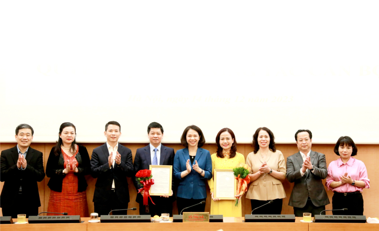 Phó Chủ tịch UBND TP Vũ Thu Hà trao Quyết định và tặng hoa chúc mừng 2 Phó Giám đốc Sở GD&ĐT Hà Nội