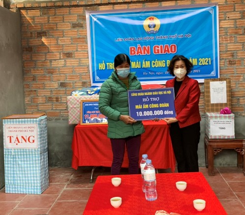 Tại gia đình đồng chí Trịnh Thị Vân - đoàn viên công đoàn Trường THCS Thị trấn Vân Đình và đồng chí Bùi Thị Hoa - đoàn viên công đoàn Trường MN Viên Nội, Liên đoàn Lao động Thành phố đã trao hỗ trợ mỗi gia đình 30 triệu đồng, Công đoàn ngành Giáo dục hỗ trợ mỗi gia đình 10 triệu đồng, Liên đoàn Lao động Huyện hỗ trợ mỗi đoàn viên 10 triệu đồng. Ngoài ra Mặt trận Tổ quốc, Hội Chữ thập đỏ Huyện, các đơn vị nhà trường cũng trao quà hỗ trợ cho hai cô giáo để xây dựng lại ngôi nhà đã xuống cấp theo Chương trình “Mái ấm công đoàn năm 2021”.