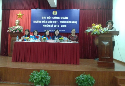 Thay mặt Ban Chấp hành Công đoàn trường Mẫu giáo Việt - Triều hữu nghị, đồng chí Vũ Ngọc Lan Hoa - Chủ tịch Công đoàn trình bày Báo cáo tổng kết nhiệm kỳ 2012-2015, phương hướng nhiệm kỳ 2015 - 2020. Nhiệm kỳ 2012-2015, Công đoàn trường Mẫu giáo Việt-Triều hữu nghị liên tục đạt Công đoàn Vững mạnh xuất sắc và được Tổng Liên đoàn Lao động Việt Nam, CĐGD Việt Nam, Công đoàn ngành tặng Cờ thi đua xuất sắc, Bằng khen và Giấy khen. Trong công tác tuyên truyền, Công đoàn Trường đã phối hợp với chính quyền các cấp tổ chức tốt hoạt động tuyên truyền giáo dục, phổ biến, triển khai kịp thời kế hoạch và nhiệm vụ năm học gắn với việc đẩy mạnh học tập và làm theo tấm gương đạo đức Hố Chí Minh; thực hiện tốt Quy chế dân chủ trong nhà trường, nâng cao chất lượng đội ngũ đổi mới phương pháp dạy học.