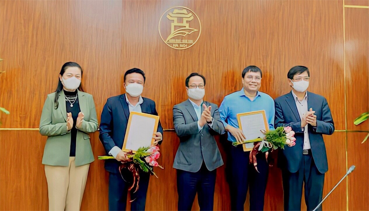 Ban Giám đốc Sở Giáo dục và Đào tạo Hà Nội trao quyết định và tặng hoa chúc mừng đồng chí Lê Hồng Vũ và đồng chí Tô Văn Nhân