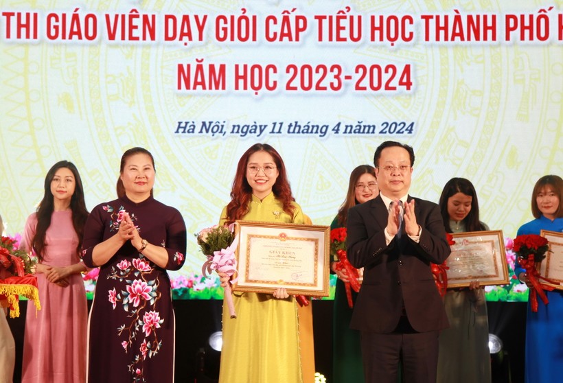 | Giám đốc Sở GD&ĐT Hà Nội Trần Thế Cương và Phó Vụ trưởng Vụ Giáo dục Tiểu học Trịnh Hoài Thu tặng giấy khen cho giáo viên đoạt giải Nhất. |