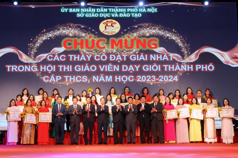 | Lãnh đạo Sở Giáo dục và Đào tạo Hà Nội trao thưởng giáo viên đoạt giải Nhất. |