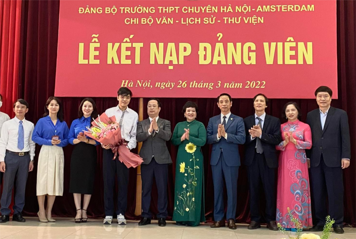 Lãnh đạo Sở Giáo dục và Đào tạo Hà Nội, lãnh đạo quận Cầu Giấy tặng hoa chúc mừng đảng viên đầu tiên là học sinh của Trường Trung học phổ thông chuyên Hà Nội - Amsterdam.