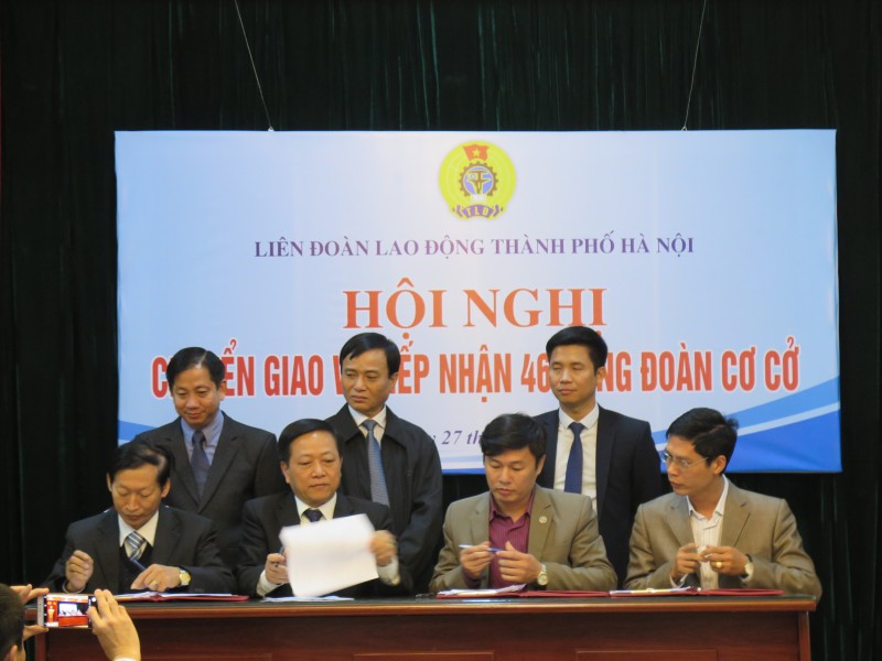Ngay tại hội nghị, trước sự chứng kiến của các đồng chí lãnh đạo LĐLĐ Thành phố, đồng chí Trần Văn Thảnh - Phó Chủ tịch Công đoàn ngành Giáo dục Hà Nội, diện Ban Thường vụ ngành Giáo dục Hà Nội và đại diện lãnh đạo các LĐLĐ quận, huyện, thị xã đã ký biên bản bàn giao và tiếp nhận 46 CĐCS từ Công đoàn ngành Giáo dục Hà Nội về sinh hoạt tại LĐLĐ các quận, huyện, thị xã trên địa bàn Thành phố.