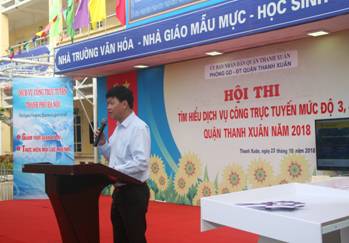Thực hiện Công văn số 3655/SGDĐT-VP ngày 30/8/2018 của sở GD&ĐT Hà Nội, phòng GD&ĐT quận Thanh Xuân đã ban hành Kế hoạch số 48/KH-PGD ngày 09/10/2018 về việc tổ chức Hội thi ”Tìm hiểu các dịch vụ công trực truyến mức độ 3,4 năm 2018”. Trên cơ sở những thành tích đã đạt được về công tác tuyên truyền dịch vụ công trực tuyến cho học sinh trong những năm học vừa qua, ngay từ đầu năm học 2018-2019, 100% các trường THCS trong quận đã tổ chức Hội thi giữa các khối hoặc các lớp đảm bảo học sinh trong toàn trường đều được tham gia. Phát biểu tại Lễ khai mạc, đồng chí Phạm Gia Hữu - QUV, Trưởng phòng GD&ĐT khẳng định: Hội thi không chỉ nhằm đánh giá công tác tuyên truyền về dịch vụ công trực tuyến của các nhà trường tới học sinh và người dân mà còn là sân chơi bổ ích giao lưu, học hỏi, trao đổi những kiến thức, kinh nghiệm giữa các trường để góp phần đưa những kiến thức, hiểu biết về dịch vụ công trực tuyến mức độ 3,4 đi vào cuộc sống. Đến với Hội thi cấp Quận có 11 đội thi đại diện cho hơn 12.000 học sinh các trường THCS trong quận. Các phần thi Chào hỏi, Hiểu biết và Tài năng đã được các đội thi thể hiện dưới nhiều hình thức sáng tạo, thông minh phù hợp với lứa tuổi học sinh cấp THCS.Với tài năng và sự hiểu biết của bản thân, các em học sinh đã cho chúng ta thấy tuyên truyền DVC trực tuyến không còn là hoạt động tuyên truyền nhàm chán, khô khan, mà trở nên gần gũi, dễ hiểu và nhiều tiện ích đối với mỗi người dân.
