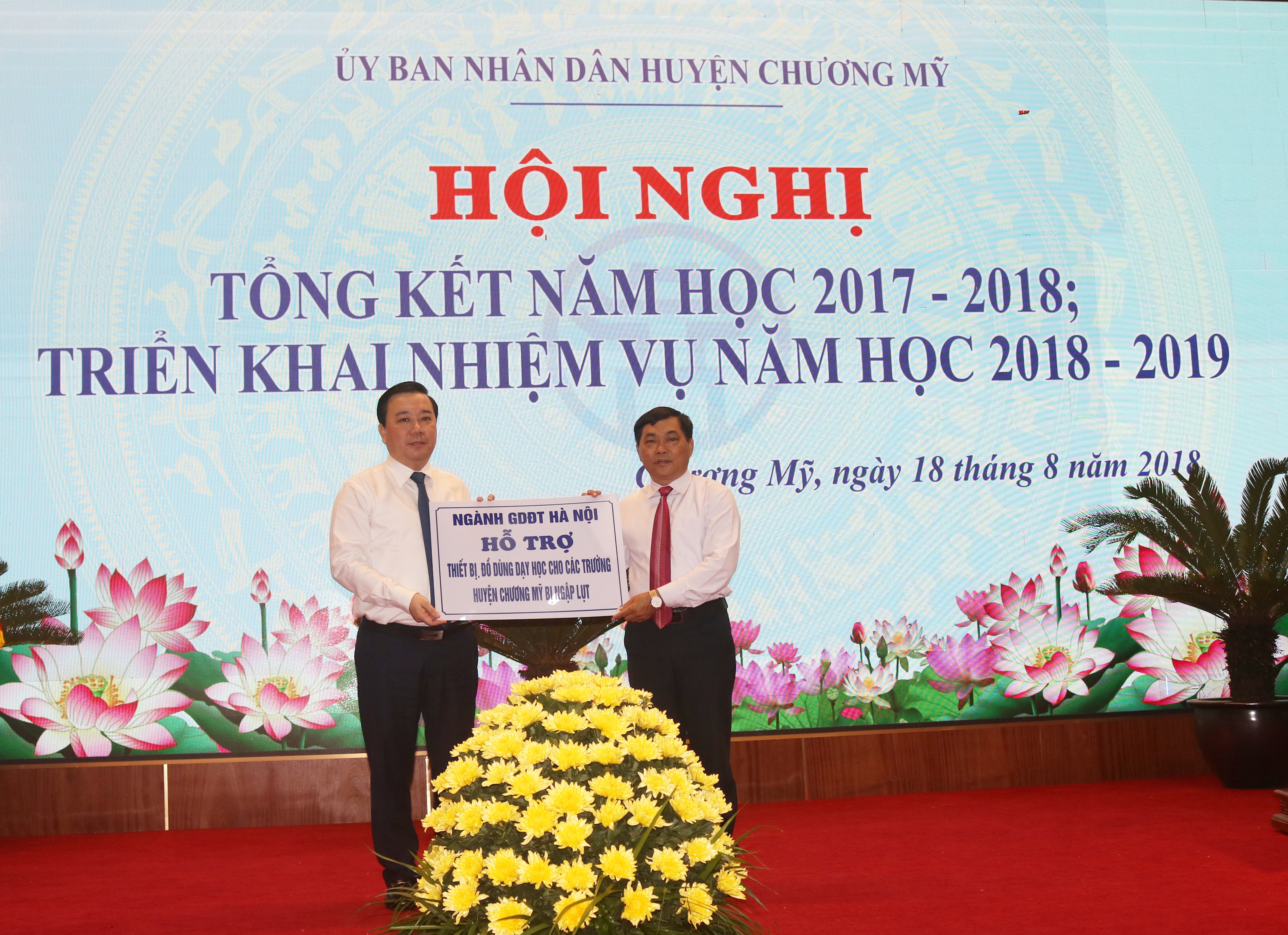 Tại hội nghị, với tinh thần tương thân, tương ái, lá lành đùm lá rách, thay mặt ngành GD&ĐT Hà Nội, Giám đốc Sở GD&ĐT Chử Xuân Dũng đã trao hỗ trợ nhiều trang thiết bị dạy và học cho các nhà trường trên địa bàn huyện Chương Mỹ bị ảnh hưởng nặng của đợt ngập úng vừa qua; trao hỗ trợ cho 35 CBGV-NV bị thiệt hại do mưa lũ. Tính đến nay, ngành GD&ĐT Hà Nội đã ủng hộ cho 5 trường của huyện Chương Mỹ (THCS Nam Phương Tiến A, TH Nam Phương Tiến A, MN xã Nam Phương Tiến khu A, THCS Hoàng Văn Thụ, TH Quảng Bị) với tổng số tiền là 1 tỷ đồng; trao hỗ trợ cho 35 CBGV – NV bị thiệt hại do mưa lũ tổng số tiền hỗ trợ là 70 triệu đồng. Các đơn vị (phòng GD&ĐT quận Thanh Xuân, Hoàn Kiếm, Hai Bà Trưng, Cầu Giấy, Long Biên và trường THPT chuyên Nguyễn Huệ) đã ủng hộ các trường của huyện Chương Mỹ tiền và nhiều trang thiết bị dạy và học như bàn ghế, máy tính, bàn thí nghiệm, sách vở, đồ dùng học tập…