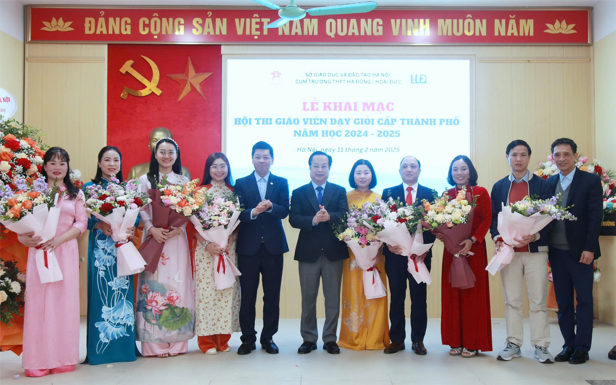 | Lãnh đạo Sở GD&ĐT Hà Nội tặng hoa chúc mừng các thầy cô giáo dự hội thi. |