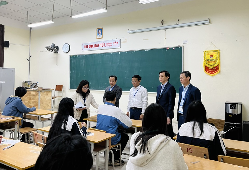 Giám đốc Sở GD&ĐT Hà Nội Trần Thế Cương và đoàn công tác kiểm tra công tác tổ chức thi tại điểm thi Trường THPT Phan Đình Phùng.Nội dung đề thi bao gồm toàn bộ chương trình lớp 10, 11 và một phần chương trình lớp 12 tính đến trước ngày thi theo Chương trình giáo dục phổ thông 2018.