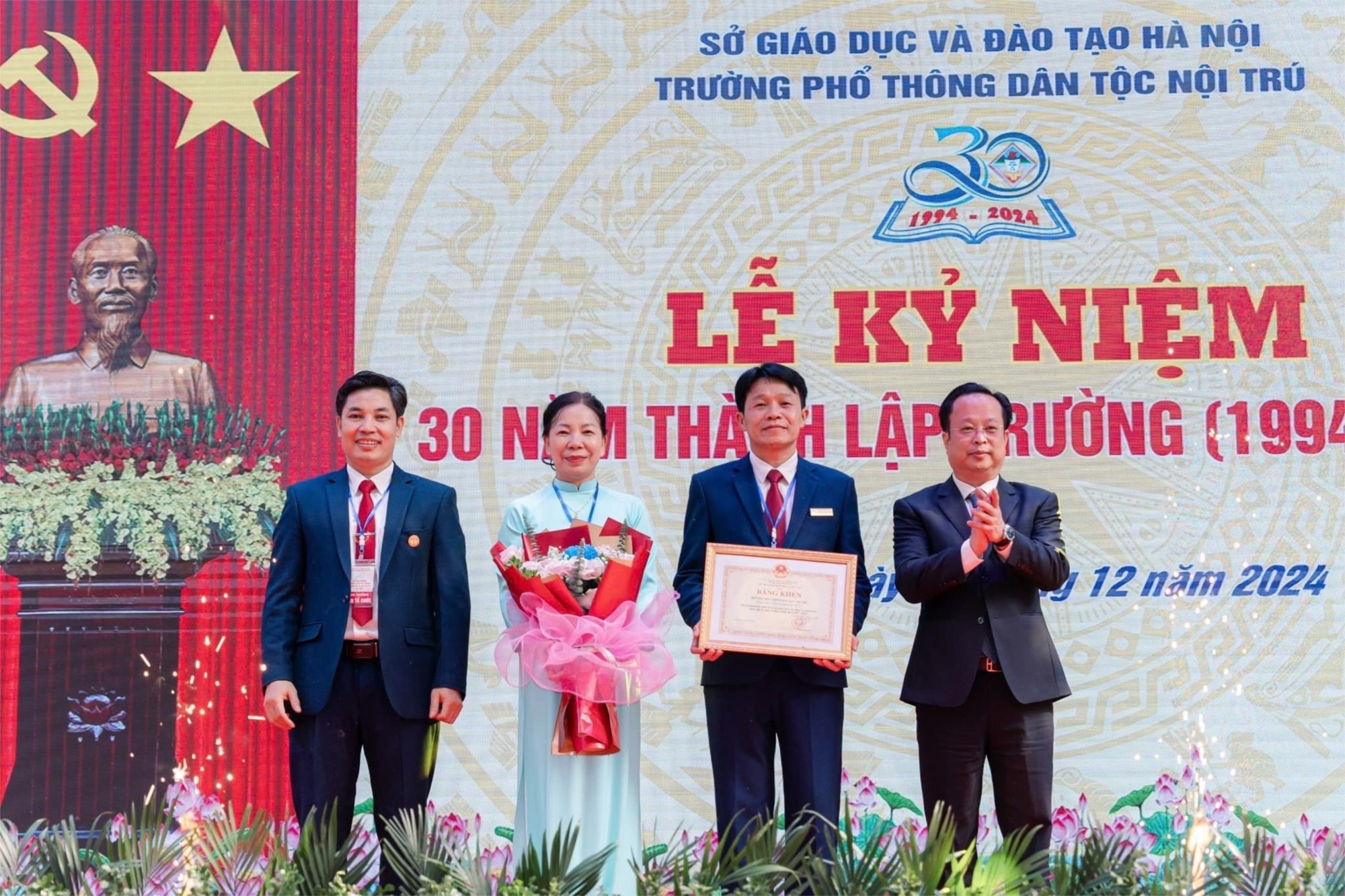 Phát biểu tại buổi lễ, đồng chí Trần Thế Cương – Thành uỷ viên, Giám đốc Sở GD&ĐT Hà Nội ghi nhận và biểu dương những nỗ lực của thầy và trò trong suốt 30 năm qua, nhà trường từng bước vượt qua mọi khó khăn, vươn lên phấn đấu hoàn thành xuất sắc nhiệm vụ được giao, góp phần thực hiện thắng lợi nhiệm vụ giáo dục của huyện Ba Vì nói riêng và thành phố Hà Nội nói chung. Đồng chí Giám đốc cũng bày tỏ sự trân trọng, tri ân những tình cảm, sự đóng góp của các thế hệ cán bộ quản lý, các thầy giáo cô giáo của trường Phổ thông Dân tộc nội trú trong sự nghiệp phát triển giáo dục thủ đô, đồng thời chúc mừng và biểu dương những thành tích của trường Phổ thông Dân tộc nội trú Hà Nội đã đạt được, mong muốn thầy và trò phát huy bề dày truyền thống, tiếp tục đưa nhà trường phát triển vững chắc lên tầm cao mới, phù hợp với yêu cầu giáo dục trong giai đoạn hiện nay và vươn tầm hội nhập quốc tế. Để thực hiện được mục tiêu này, Trường Phổ thông Dân tộc nội trú Hà Nội phải tiếp tục thực hiện có hiệu quả chủ trương “Mỗi thầy giáo, cô giáo là một tấm gương đạo đức, tự học và sáng tạo”. Rà soát các tiêu chí, đề ra giải pháp khả thi để xây dựng thành trường trọng điểm chất lượng cao.