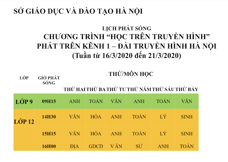 Lịch phát sóng tuần từ 16/3/2020 đến 21/3/2020; Chương trình học trên truyền hình phát sóng trên kênh 1 – Đài Phát thanh và Truyền hình Hà Nội cụ thể như sau: