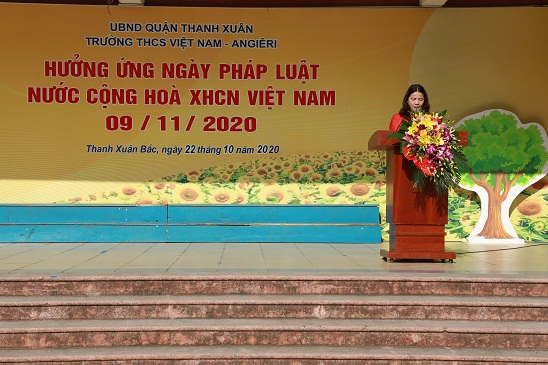 Thực hiện chỉ đạo Sở GD&ĐT Hà Nội và UBND quận Thanh Xuân, sáng ngày 22/10/2020, trường THCS Việt Nam - Angiêri tổ chức điểm chương trình hưởng ứng “Ngày Pháp luật nước Cộng hòa Xã hội Chủ nghĩa Việt Nam” trong ngành GD&ĐT Thủ đô năm 2020. Đến dự có: Sở GD&ĐT Hà Nội: Đồng chí Đàm Xuân Quang - Phó Chánh Văn phòng; quận Thanh Xuân: Đồng chí Nguyễn Văn Bình - Phó Chủ tịch Thường trực HĐND quận, đồng chí Phạm Gia Hữu - QUV, Trưởng phòng GD&ĐT; đại diện Lãnh đạo các phòng: Tư pháp, Lao động - Thương binh và Xã hội, Văn hóa và Thông tin; Lãnh đạo, chuyên viên phòng GD&ĐT; Lãnh đạo phường Thanh Xuân Bắc; đại diện Ban giám hiệu các trường mầm non, tiểu học, THCS; CB, GV, NV và học sinh trường THCS Việt Nam - Angiêri.