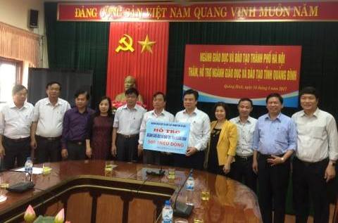 Đoàn công tác của ngành GD&ĐT Hà Nội đã trao trao hỗ trợ xây dựng nhà công vụ giáo viên trường học vùng khó khăn ngành GD&ĐT tỉnh Hà Tĩnh và tỉnh Quảng Bình mỗi tỉnh 500 triệu đồng, hỗ trợ khó khăn trường THCS Đồng Lộc, tỉnh Hà Tĩnh, trường Mầm non Quảng Đông huyện Quảng Trạch, tỉnh Quảng Bình mỗi trường 100 triệu đồng, hỗ trợ giáo dục khó khăn ngành GD&ĐT tỉnh Nghệ An 100 triệu đồng. Tổng số tiền trao hỗ trợ là 1,3 tỷ đồng.