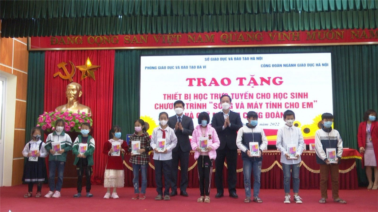 Các đồng chí Lãnh đạo Công đoàn ngành GD Hà Nội, UBND huyện Ba Vì trao tặng thiết bị học trực tuyến cho HS nghèo