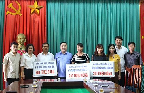 Trong những ngày vừa qua, mưa lớn đã làm ảnh hưởng đến sinh hoạt và cuộc sống của nhân dân một số xã trên địa bàn huyện Chương Mỹ. Trong đó, có 3 xã bị ảnh hưởng nặng là Nam Phương Tiến, Tân Tiến và Hoàng Văn Thụ. Trước tình hình đó, để kịp thời hỗ trợ các địa phương và nhân dân vùng bị ảnh hưởng bởi thiên tai; sáng 1/8, đồng chí Chử Xuân Dũng - Giám đốc Sở Giáo dục và Đào tạo thành phố Hà Nội cùng đồng chí Trần Thị Thu Hà - Chủ tịch Công đoàn ngành giáo dục và Đào tạo thành phố Hà Nội đã đến đã đến thăm hỏi, chia sẻ động viên cán bộ, nhân dân huyện Chương Mỹ nói chung và giáo viên, học sinh vùng bị ngập úng trên địa bàn huyện nói riêng; đồng thời, trao 1 tỷ đồng trích từ quỹ vận động ủng hộ nhà giáo vùng cao, vùng xa, vùng đặc biệt khó khăn của cán bộ, giáo viên, nhân viên ngành giáo dục Hà Nội. Số tiền 1 tỷ đồng được trao cho 5 trường bị ngập úng nặng đó là: trường THCS Nam Phương Tiến A, tiểu học Nam Phương Tiến A; trường mầm non Nam Phương Tiến, trường Tiểu học Quảng Bị (Khu 2) và trường THCS Hoàng Văn Thụ, mỗi trường học được hỗ trợ 200 triệu đồng.